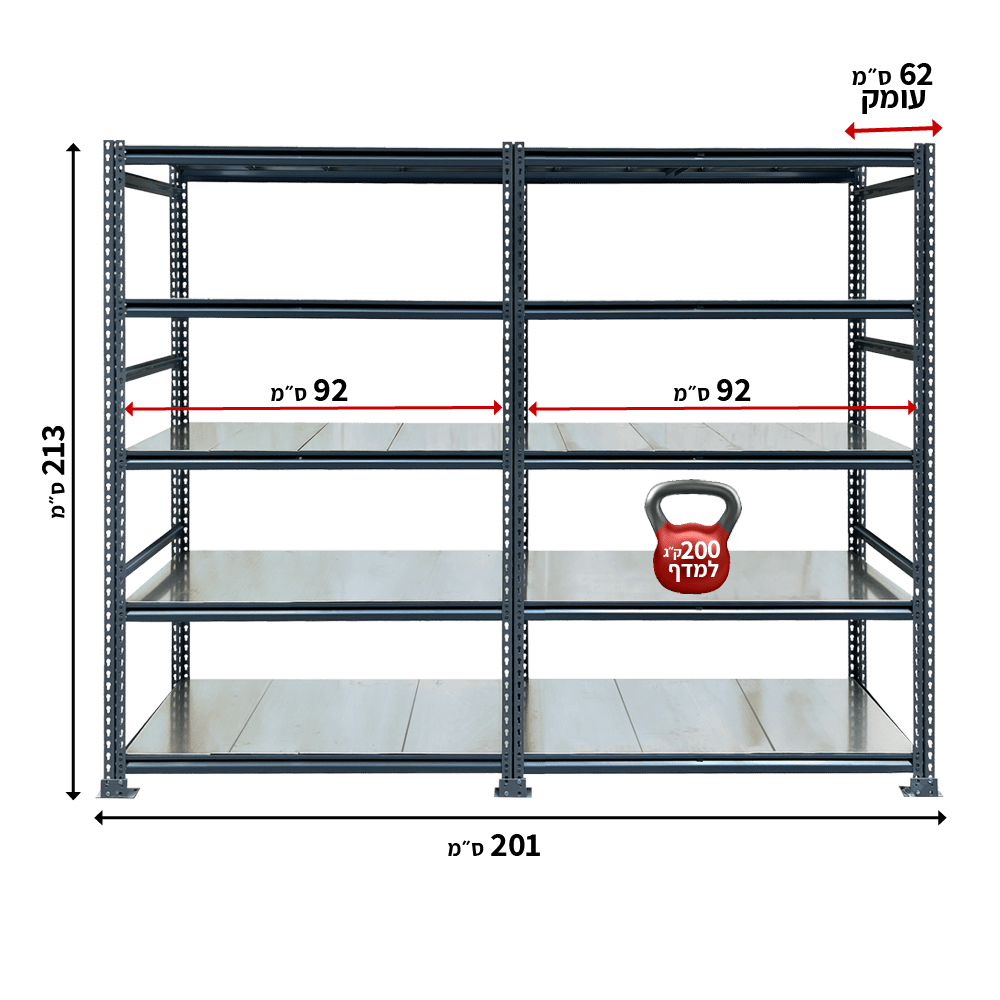 מדפים למחסן בגובה 213 ס"מ בעומק 40 ס"מ באורך 92 ס"מ